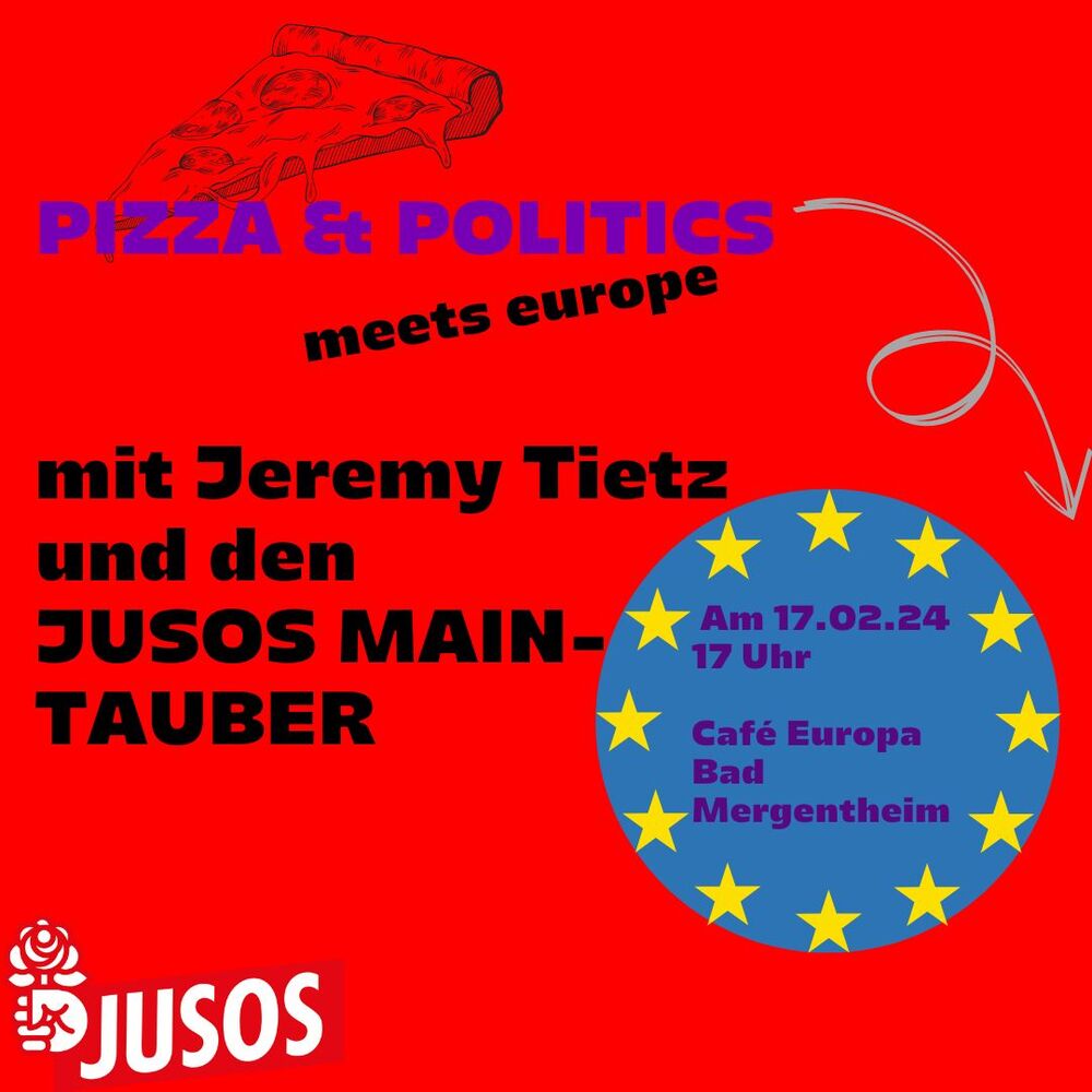 Die JUSOS Main-Tauber treffen sich zu "Pizza & Politics meets Europe" am Sa. 17.02.2024 um 17 Uhr im Cafe Europa in Bad Mergentheim (Marktplatz 12, 97980 Bad MGH).